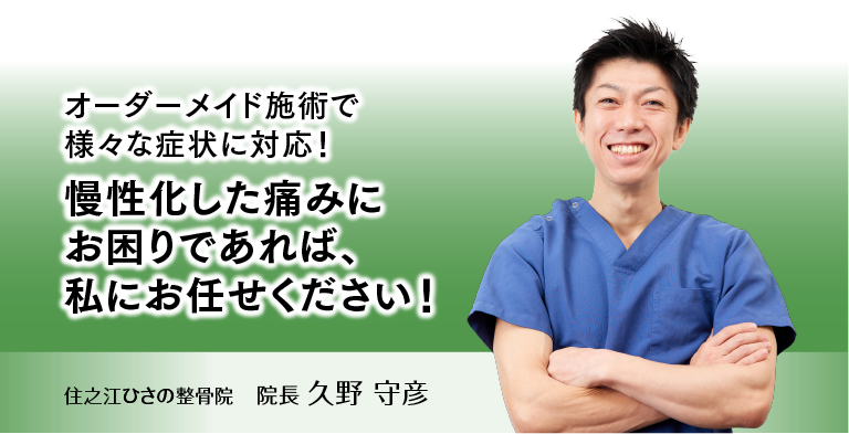 住之江ひさの整骨院〒 559-0001 大阪府大阪市住之江区粉浜3-15-41 人は元来、少し体が悪くなっても元の状態に戻す自然治癒力を持っています。しかし、毎日悪い状態が蓄積していくと、脳がその悪い状態をインプットしてしまい元に戻る事ができなくなってしまいます。これが慢性痛のメカニズムです。当院は神経整体・はり灸・足指ほぐし・パーソナルトレーニングを通してこの脳の勘違いのインプットを正していく事で、自然治癒力を取り戻し、さまざまな体の不調を改善させていきます。